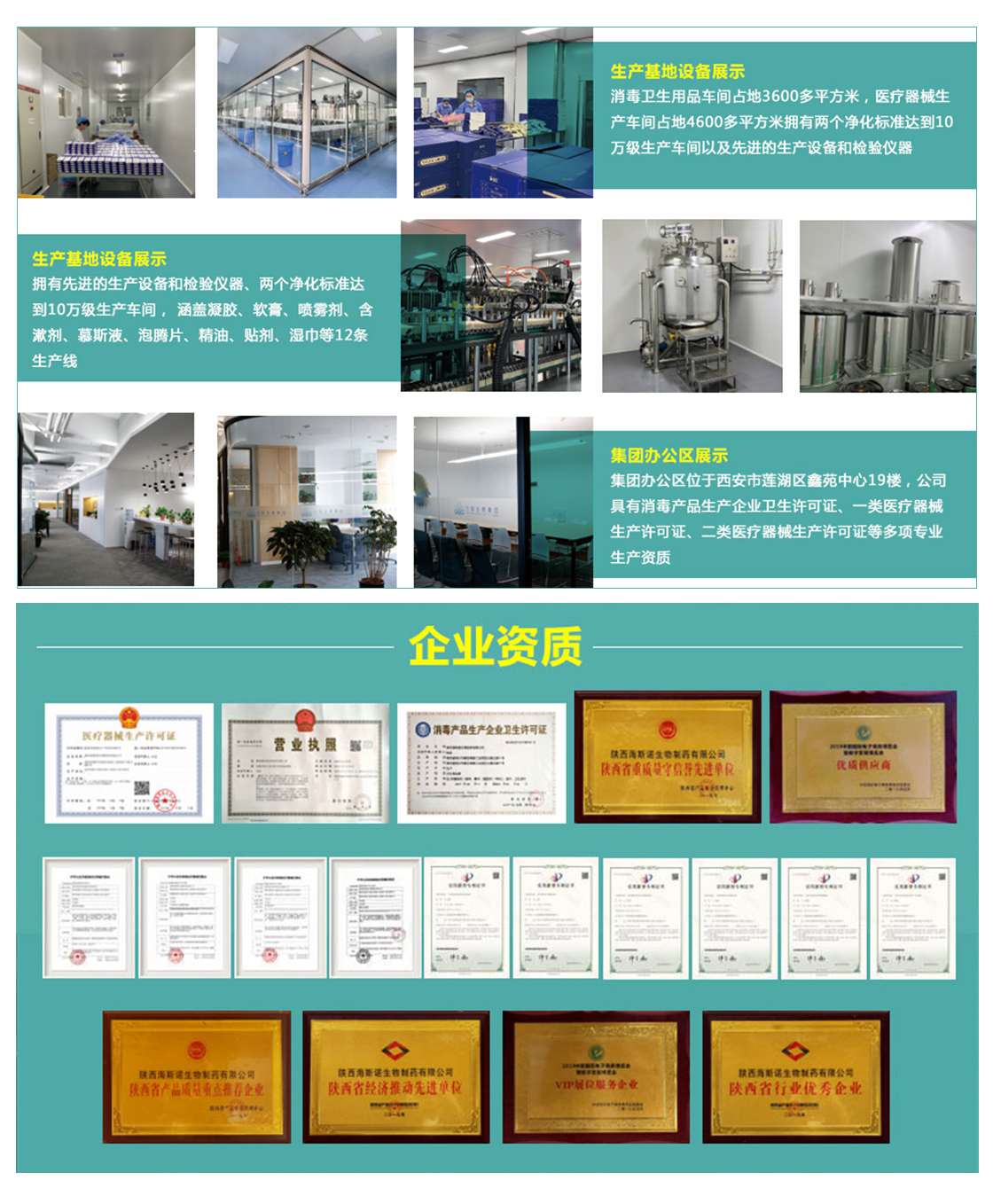 公司具有消毒产品生产企业卫生许可证、一类医疗器械生产许可证、二类医疗器械生产许可证等多项专业生产资质。企业与中国中医科学院、陕西多家 重点医院和高校科研队伍签署战略合作,运用现代 生物技术研发为企业发展奠定了强有力的技术基础。生产基地位于“药王之乡”铜川市,占地 8200多平方米,拥有先进的生产设备和检验仪器、两个净化标准达到10万级生产车间,涵盖凝胶、软膏、喷雾剂、含漱剂、慕斯液、 泡腾片、精油、贴剂、湿巾等12条生产线。