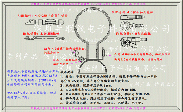 新款成人多功能胸电极连球由深圳导联线电子科技有限公司2013年8月开发与模具制造。于2013年9月申请外观专利与实用新型专利。