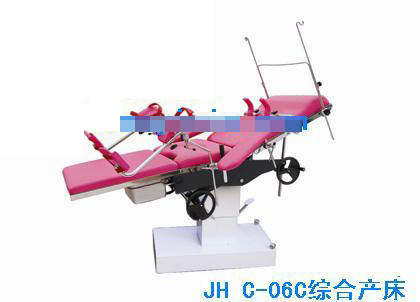 用途:本产品供临床机构妇科诊断、检查、手术及产妇分娩时使用。b)结构性能:该产品主要包括台面、底座、立柱及附件。产床腿板可拆卸。各种动作均为人力操作,前后倾调整为机械传动机构,背板采用手动气压弹簧结构,角度可调。台面升降为液压机构。该产品通过人工操作,能够满足临床机构妇科诊断、检查、手术、产妇分娩时所需体位的要求。按照外罩壳材质的不同,分为JHC-06型和JHC-06A型两种型号,其中JHC-06型为普通钢外罩壳,JHC-06A型为不锈钢外罩壳。各项技术参数及产品结构相同。使用说明:1)?油泵升降操纵:综合产床专业厂家、综合产床质量好、综合产床信誉油泵升降操纵:油泵升高,踩底盘上的踏脚,每踩一次,床面亦随之向上升起一段高度。如需下降,将底盘上的踏脚踩到底不放,床面即行下降,下降速度随足踏力量变化。产床的升降是借油泵结构进行调节,出厂时油泵内油抽出装在桶里,油泵不能升高。用户可将油泵顶面加油孔盖拨开,由此用一个漏斗将油桶里的油慢慢加进油泵,直至油泵可升到高位置为止(注意:需将油桶的油全部加入,否则会出现台面升不到高点的现象)。底盘的移动与固定:将底盘上固定脚手柄反时针拧松后,产床即可推动移位。反之,可以固定。(注意:不可以只拧松或旋紧1只手柄,否则会出现底座不稳的现象。)2)?操纵手轮作用:前后倾用一对手轮操纵,装置在床两侧,操纵方便。3)背板折转:背板角度调节采用气动装置,可在调节范围内任一位置调节。若需上折背板,一手扳动背板气压弹簧手柄(即打开气缸阀门),另一手把背板端头向上拉,实现背板折转的角度,当背板上折到所需的位置时,放开扳手,背板即固定在该位置上。若需下折背板,一手扳动背板的扳手,另一手把背板端头向下压,当背板下折到所需的位置后,放开扳手,背板即固定在该位置上。4)腿板拆卸:旋松腿板下面的的两个固定旋钮,即可将腿板抽出取下。插上腿板时,必须旋紧固定旋钮,谨防操作时滑落。