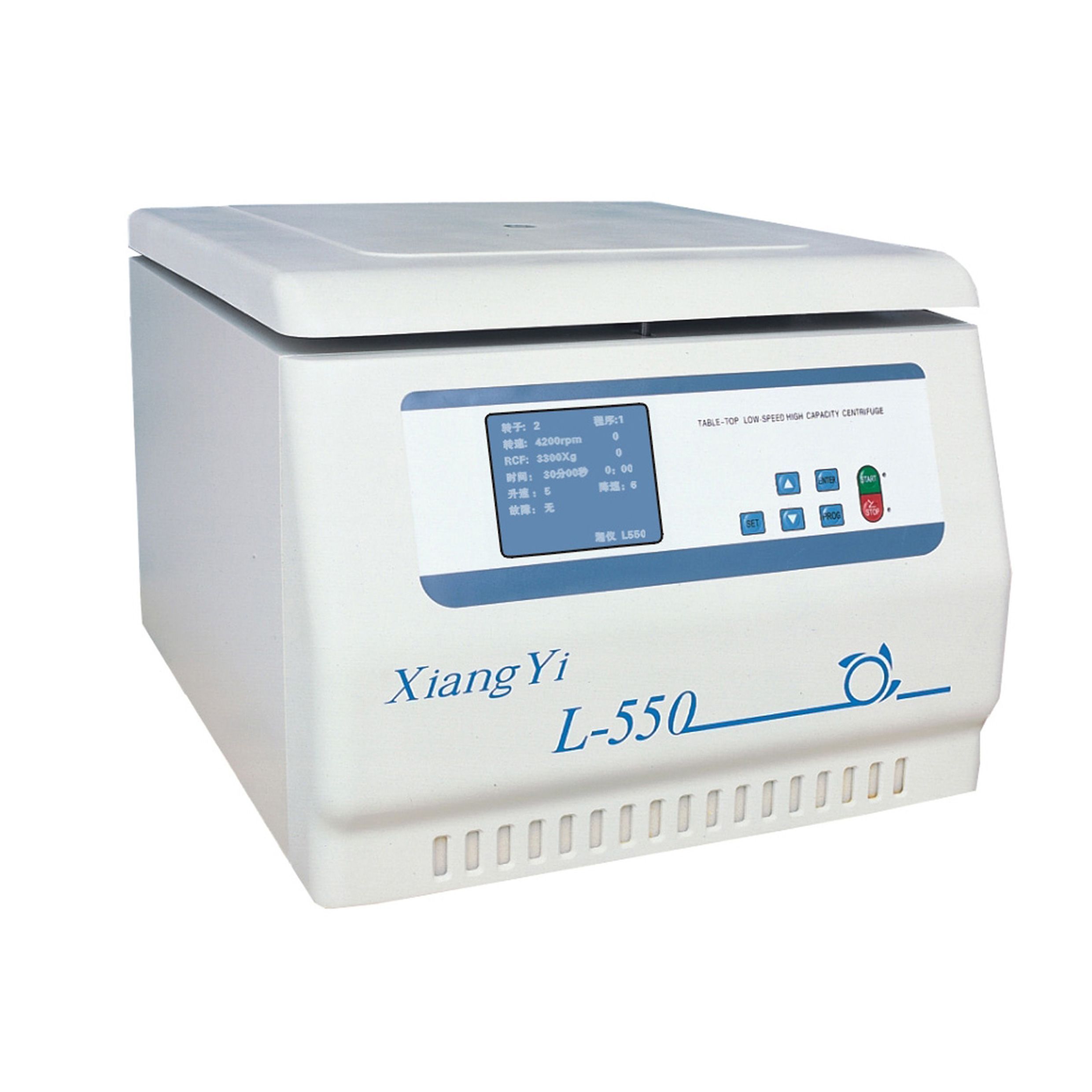L-550台式低速大容量离心机 L550 TABLE-TOP LOW-SPEED HIGH COAPACITY CENTRIFUGE 台式低速离心机L-550微机控制、数码管显示(LED)或大屏幕液晶显示(LCD)(用户选购)、触摸面板、直流无刷电机或交流变频电机(用户选配)、无碳粉污染,多种转子、方便用户选用。◆?台式低速离心机L-550具有电子门锁,提高操作安全性。◆?台式低速离心机L-550时间设定可以到秒,转速可以低至300rmin(精度±30rmin),满足用户的特殊要求。◆?台式低速离心机L-550具有快速升速、快速降速功用,快升速时间为30秒,快降速时间为28秒。可以选择不同的升、降速时间。◆台式低速离心机L-550 自动计算RCF值、具有自动平衡功能。 台式低速离心机L-550技术参数 TECHNICAL?PARAMETER型号ModelL-550高转速Max speed5500rmin大相对离心力Max RCF5310×g大容量Max Capacity2000ml(4×500ml)定时范围Time Range0~99min (LED)1S~99min59S (LCD)短加减速时间The fast time of AccDec3028s转速精度Speed Accuracy±30rmin电源Power supplyAC220V 50Hz ?6A整机噪声Noise<65dB(A)外形尺寸Dimension470×560×380mm(L×W×H)重量Weight52kg L-550 台式低速大容量离心机转子 转子Rotor容量Capacity高转速Max.speed大相对离心力Max.RCF试管类型1号角转子12×10ml55005310G.PP2号水平转子圆杯转子4×500ml40003040PP平底瓶适配器4×250mlPP平底瓶4×3×50mlPP尖底或圆底4×7×20mlPP4×9×15mlPP尖底或圆底4×19×5ml真空采血管方形吊篮适配器112×5 ml40003040另购(真空采血管适用)100×1.5ml另购 Eppendof管80×10ml另购(玻管适用)40×15 ml另购(玻管适用)40×15 ml另购(尖底带刻度管适用)16×50 ml另购(圆管适用)16×50 ml另购(尖底带刻管适用)挂杯4×37×5mlG放免管4×24×7ml40003040真空采血管酶标板吊篮4×2×96孔4000304096孔酶标板3号酶标板转子2×2×96孔4000220096孔酶标板4号水平转子4×50ml50004390G4×100ml50004390PP5号水平转子8×50ml42003100PP尖底、圆底8×100ml42003100PP32×15m10ml、7ml适配器42003100G\PP48×5ml7ml42003100真空采血管72×5ml(φ13x70管)42003100G放免管,真空采血管64*7ml5ml42003100