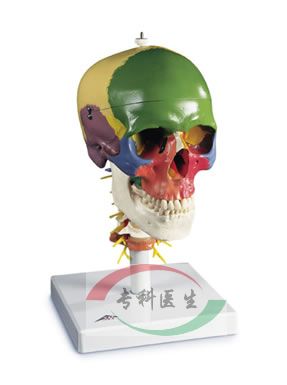 此款模型采用19种豪华色彩来展现头颅各种骨片的形状和关联。竖于颈椎上并能灵活移动(C1, C2 及C7有色彩), 此款模型展示了菱脑、脊髓、颈椎神经、脊椎动脉、基底动脉和后脑动脉。置于基架上。