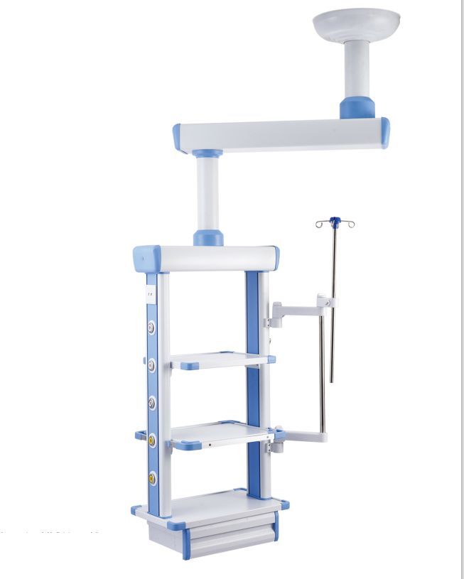 主要参数: 1.水平旋转角度:0—340° 2.终端箱上大承重:80kg 3.标准供气:2个氧气、2个吸引、1个空气 4.标准供电:3孔电源插座8个 5.设备托盘:3个 6.输液杆架:一套 (平台、抽屉、气体接口、电源插座、网络接口\电话接口 可根据客户要求灵活选配。) 腔镜塔作为腔廓治疗设备的承重平台,为您的手术工作提供了个全方位的服务。腔镜塔采用天花板悬挂方式、高承载能力.塔体和横臂能在一定范围不同方向旋转340度,并可选配气动刹车,可根据医护人员要求.轻松移动和锁定塔体位置。塔身配置有设备平台以及医气终端、电源输出插座等。