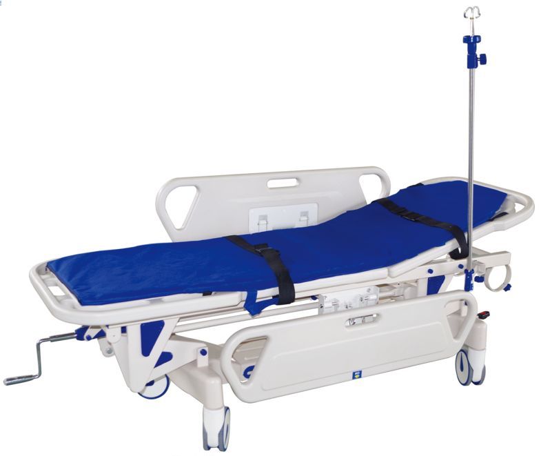 ·医用转运车、ABS转运车、ABS豪华转运车、医用平车、手术推车医用平车1、平车主要框架采用优质铝合金材料,外形美观豪华,结构牢固可靠。 2、平车面及护栏采用ABS材料,整体美观,容易清理。 3、背部可调节,采用意大利进口背部阻尼器作支撑力源,操作方便。 4、护栏升降采用气动助力,轻松省力。 5、平车整体升降及倾斜采用液压助力装置,脚踏升降,操作轻松简单,所有操作指示明白准确,一目了然,简单容易。脚踏可调节,平车面倾斜角度及车面高度。 6、采用国际先进的中控刹车系统,稳定可靠。配导向轮装置,一个人可轻松操作,方向更理想。