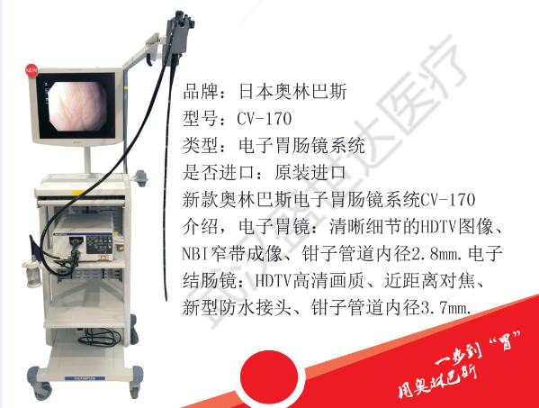 ??奥林巴斯消化内镜的技术和产品一直有口皆碑,奥林巴斯CV-170胃肠镜具有管腔细软、高密度、高画质、不失真等特点,及NBI(窄带成像技术)和电子放大功能,可以全边缘、更清晰地再现病灶图像,能直接观察病人的食管、胃肠道粘膜病变,尤其是对细小病变的检查更加仔细,可对胃肠道的一些病变,如溃疡、糜烂、出血、息肉、癌前病变、早期胃癌进行及时的观察和准确的诊断与治疗。
