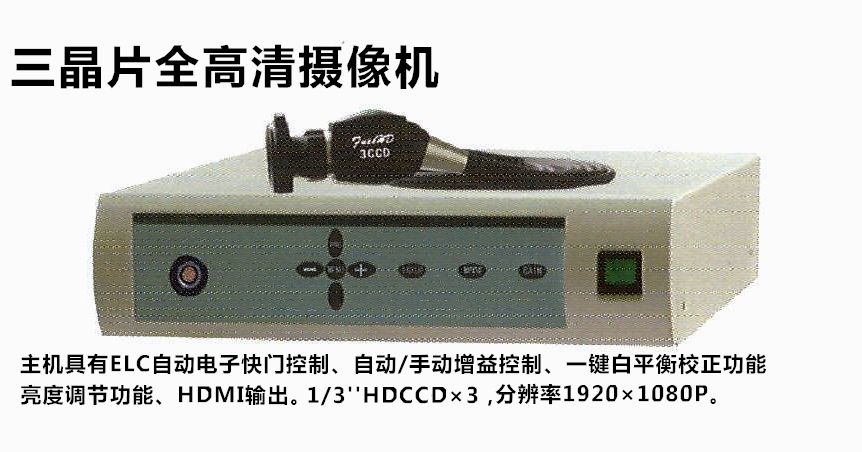 产品名称:国产三晶片全高清摄像机产品型号:产品信息: 主机具有ELC自动电子快门控制、自动手动增益控制、一键白平衡校正功能、亮度调节功能、HDMI输出。13”HDCCD×3,分辨率1920×1080P。标准C型光学接口,防水型。