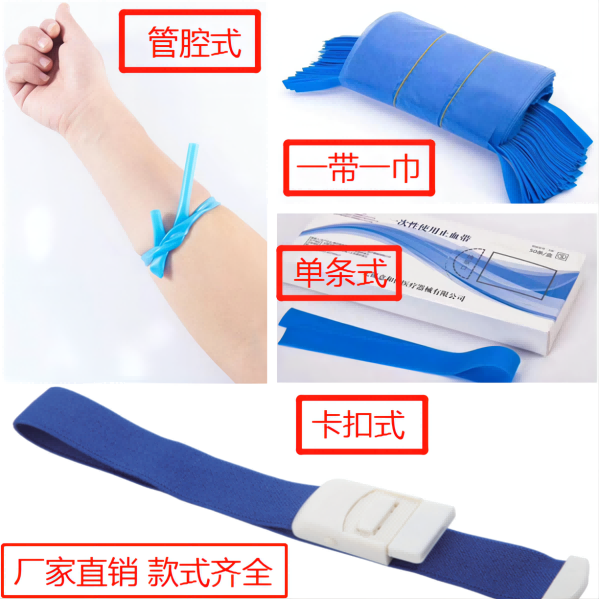 由有弹力的天然乳胶或高分子材料或合成橡胶制成,由点式相连,可持续抽取,用于医疗机构在常规静脉输液,抽血,输血时扎紧手臂,促进静脉血管充盈,便于静脉穿刺实施,同时暂时阻断静脉回流。绑扎位置应在伤口的上方(近心端),并尽量靠近伤口但不接触伤口。一次性使用。