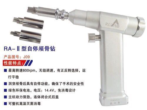 自停颅骨钻:本产品转速800rpm,无级调速,有正反转选择,方便手术需要,运行特别平稳,适用于脑外科打孔手术,配有大中小三个规格自停钻头,洞穿颅骨后,具有自停功能,也确保了手术的安全性,使用绿色环保电池,电压:14.4V,电池免消毒设计,标准配置双电池,主机动力强劲,连体闭合式后盖,并且配有双保险后盖,可以整机高温高压灭菌消毒,本产品手术效果较好,得到了医生和主任一致认可,性能可靠有保障。