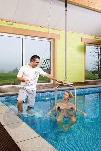 用于游泳池旁边的移位,推行至游泳池旁边,固定,即可360度移位,将被护理人员转移至泳池中。