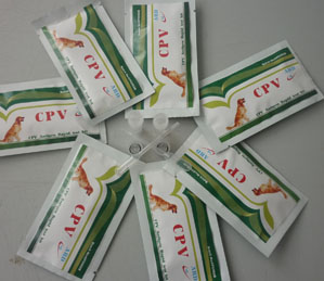 [原 理]本产品采用免疫层析金标双抗体夹心检测技术,可迅速,准确,简单地定性检测出犬类粪便中的犬细小病毒抗原(CPV)。所需验体量少,时间短(仅需10-15分钟)。在检测卡判断窗中有结果判断线“T线” 和检测控制线“C线” 。在未添加样品前,“T线”和“C线”都不显示。“C线”被用于确认样品在检测卡中是否正常展开。“T线”被用于确认样品中是否含有CPV抗原。 1)当“C线”显示时(一条紫红色线),证明样品在检测卡中正常展开了,可以进行“T线”判定。当“C线”不显示时,证明样品在检测卡中没有正常展开,检测结果无效。 2)在“C线”和“T线” 同时显示时(二条紫红色线),证明样品中含有CPV抗原。当“C线”显示而“T线”不显示时(一条紫红色线),证明样品中不含有CPV抗原。 [包装规格] 1)10份CPV抗原快速检测卡、一次性采样棉签和一次性滴管 2)10份装有反应缓冲液的样品收集管 3)1 份使用说明书。 [功能,效果] 用于犬类粪便中CPV抗原的验出。 [保存和稳定性] 常温保存,储存于阴凉避光干燥处,无需冷藏、不要冷冻,不要将试剂盒放置于太阳直射处。有效期限是18个月。 用法,用量] A:准备 1)所用样品是犬类粪便。 2)用采样棉签采集样品后必须立刻使用。B:测试步骤 1)将检测卡从铝箔袋中取出,放于水平处。 2)用采样棉签采取犬粪便约0.1g。 3)将棉签头浸入装有反应缓冲液的样品收集管中,并充分搅拌混匀。 4)用滴管吸取搅拌过的样品液,垂直滴加3滴无空气泡于检测卡加样孔内。 5)室温下静置10-15分钟后判定检测结果。[结果判定] 1)阴性结果:在检测卡视窗中,只有“C线”显示时,表示CPV抗原阴性。2)阳性结果:在检测卡视窗中,“C线”和“T线” 同时显示时,表示CPV抗原阳性。3)无效结果:“C线”不显示或“C线”和“T线”都不显示时,表示检测结果无效。# 发生此种现象的原因可能是1)使用方法不当。2)产品已经变性。 重新测试。 [使用上的注意] 1 严格按照本产品使用说明书方法进行使用。 2 只用于CPV抗原的定性检测。 3 判定结果是阴性时,并非确定为一定没有CPV抗原的存在,如果有必要可使用其他方法确认。 4 为了提高正确率,使用多处采样混合样品。 5 所有样品必须当作具有潜在传染性来处理。 6 本检测卡的结果仅供医生参考,诊断结果由医生结合临床症状等决定。 7 检测卡开封后应尽早使用。 8 采样后的样品应尽快使用。9 本产品为一次性使用产品,不要使用已用过的检测卡。 10 保管时请注意不要放在小孩能拿到的地方。 11 不要放在阳光直射,高温或冷冻的地方。 产品操作说明:[